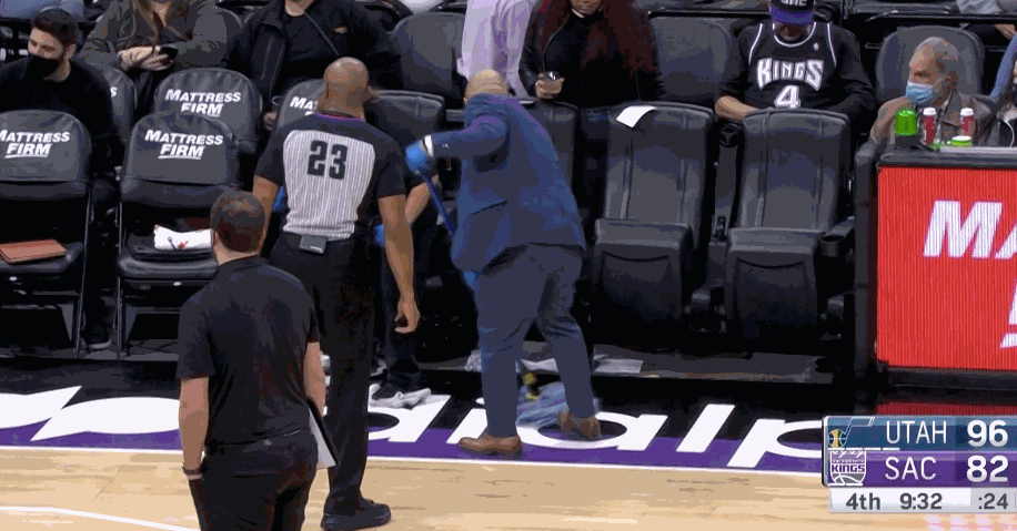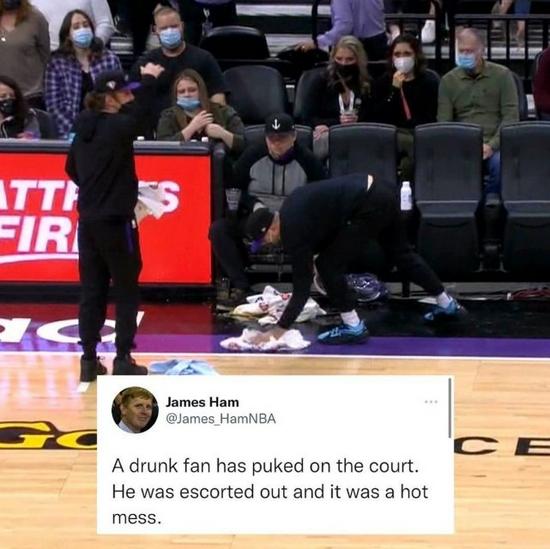 当时,第四节还剩9分32秒,爵士领先了国王14分,他们完成了一波12-2,此时,国王喊出了暂停。这是因为一名醉酒球迷在场上出现了呕吐,他随后被护送出场,国王主场的工作人员不得不长时间清理呕吐物。